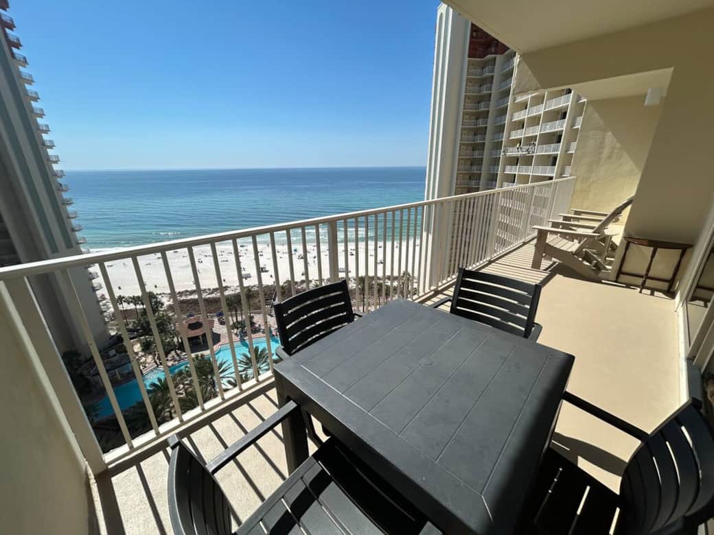 The balcony offers a dining table and chairs for 4, two Adirondack chairs, and two swinging chairs.