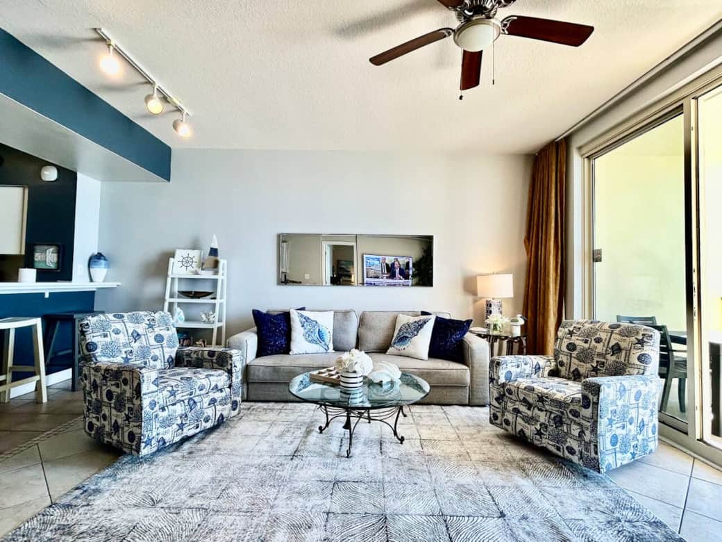 The spacious living room offers a queen pull-out sofa and a large 65" TV.