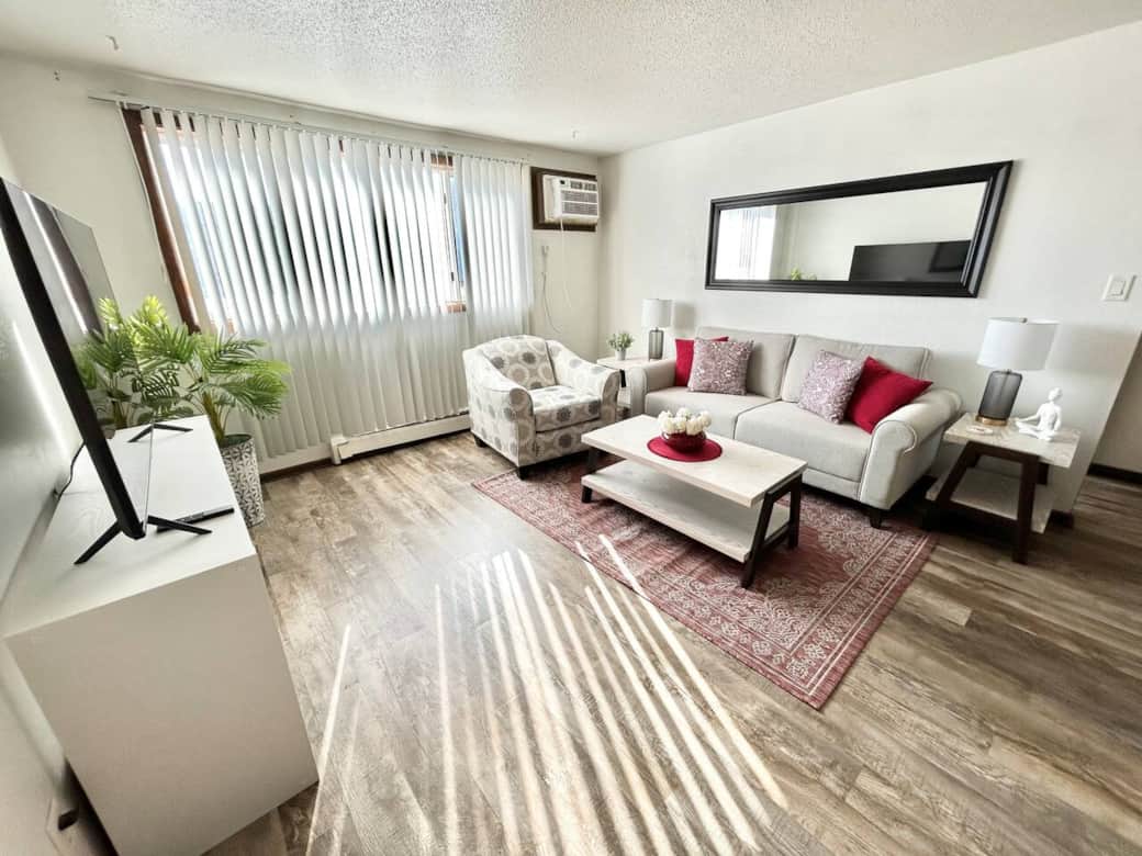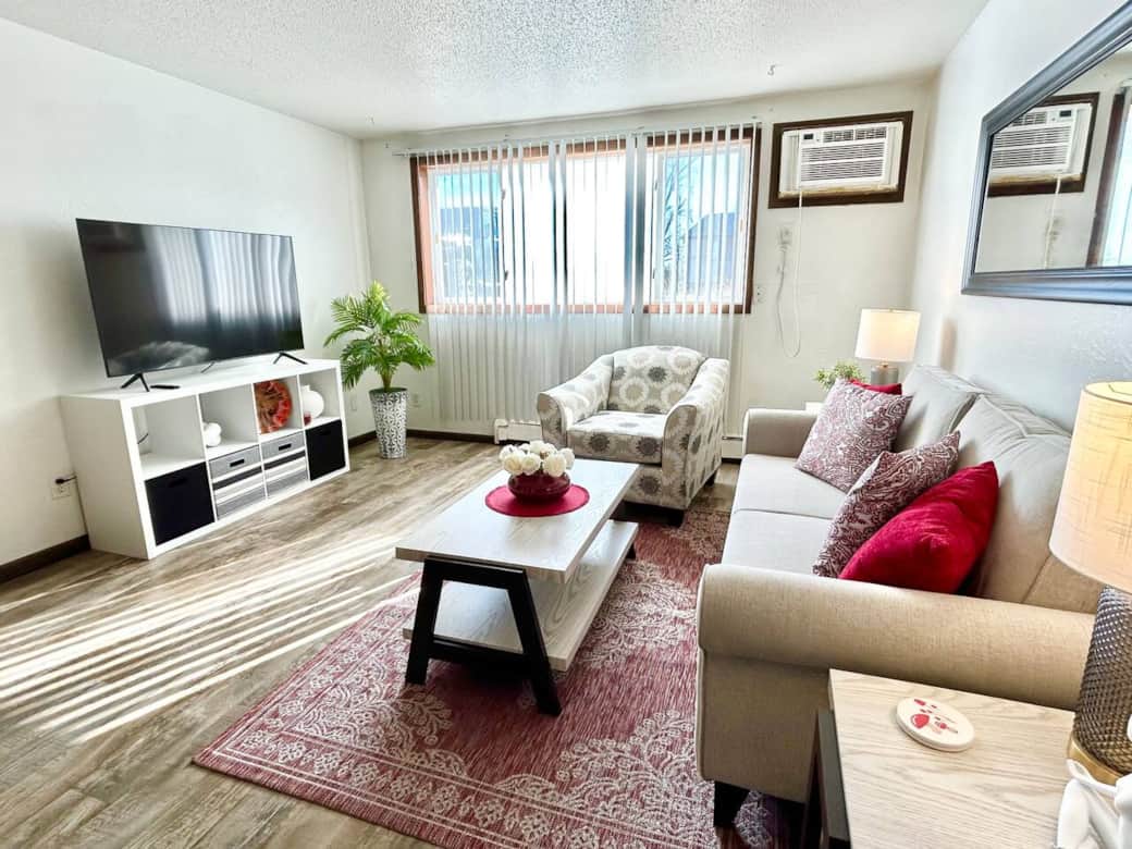 Relax in the spacious living room, equipped with a 65-inch smart TV for entertainment. The apartment includes a full bathroom and a fully equipped kitchen, providing all essentials for meal preparation and service. Stay connected with complimentary Wi-Fi and enjoy the convenience of free parking.