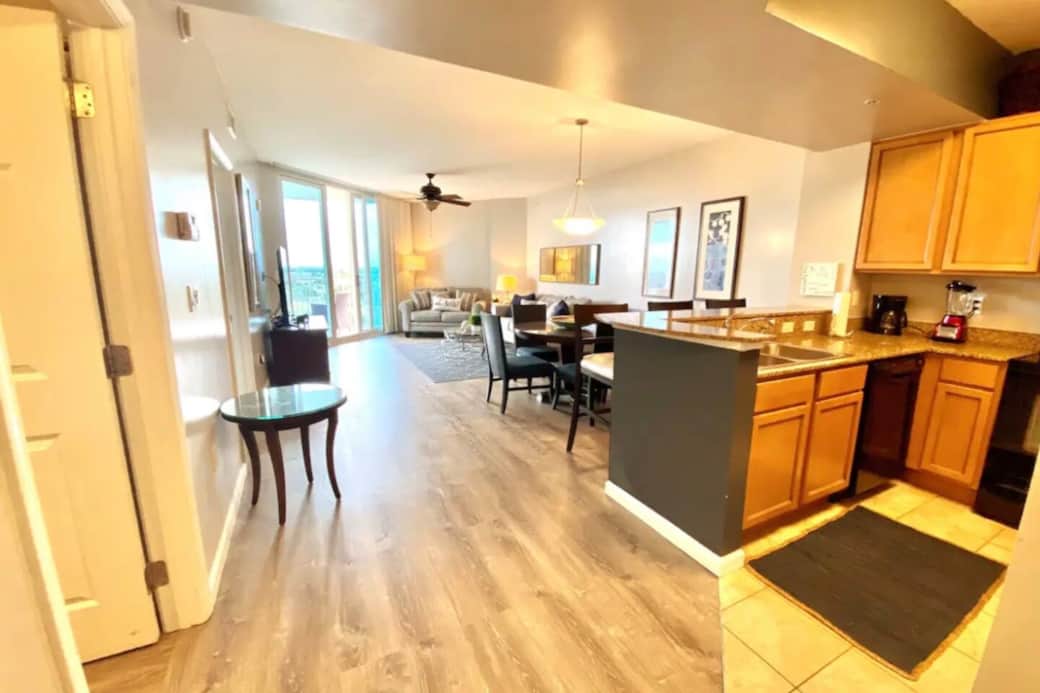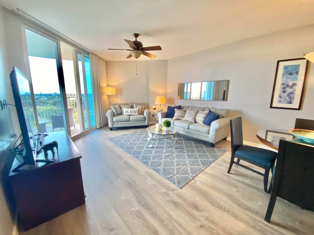 Disfruta del atractivo diseño de planta abierta con elegantes suelos de madera. Con capacidad para 6 personas, el condominio proporciona un escape sereno con un balcón espacioso que ofrece vistas a la ciudad, una cancha de tenis y vistas lejanas al Golfo de México. Ya sea disfrutando del café matutino o de una puesta de sol vespertina, el balcón se convierte en tu oasis privado.